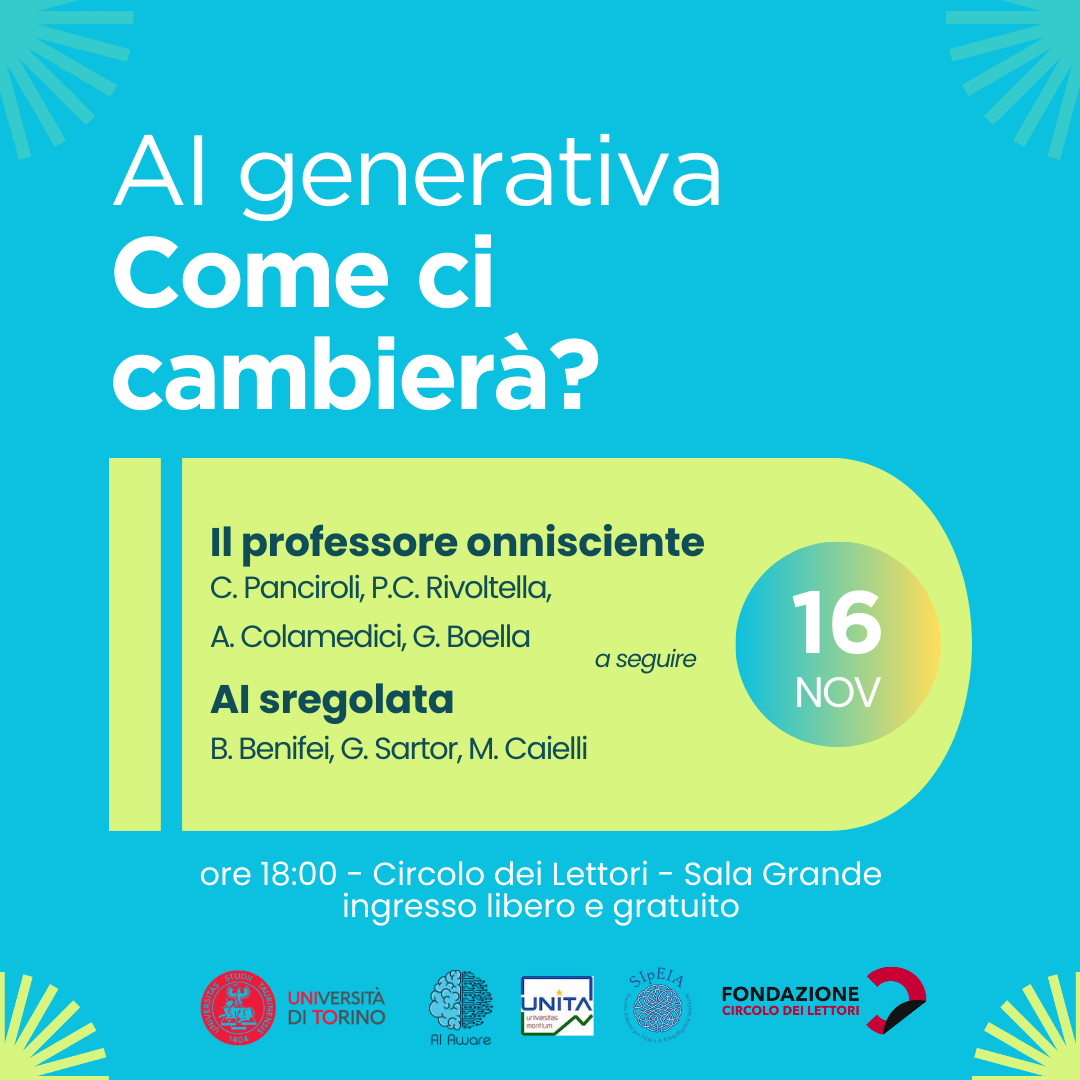 16 novembre ore 18, Circolo dei lettori di Torino – Sala Grandequarto appuntamento del ciclo AI GENERATIVA: COME CI CAMBIERÀ?con il doppio incontro IL PROFESSORE ONNISCIENTEeAI SREGOLATAUn progetto dell’Università degli Studi di Torino, Fondazione Circolo dei lettori e Società Italiana per l’Etica dell’Intelligenza Artificiale Giovedì 16 novembre alle ore 18, al Circolo dei lettori di Torino, … Leggi tutto AI GENERATIVA: COME CI CAMBIERÀ? doppio incontro IL PROFESSORE ONNISCIENTE e AI SREGOLATA